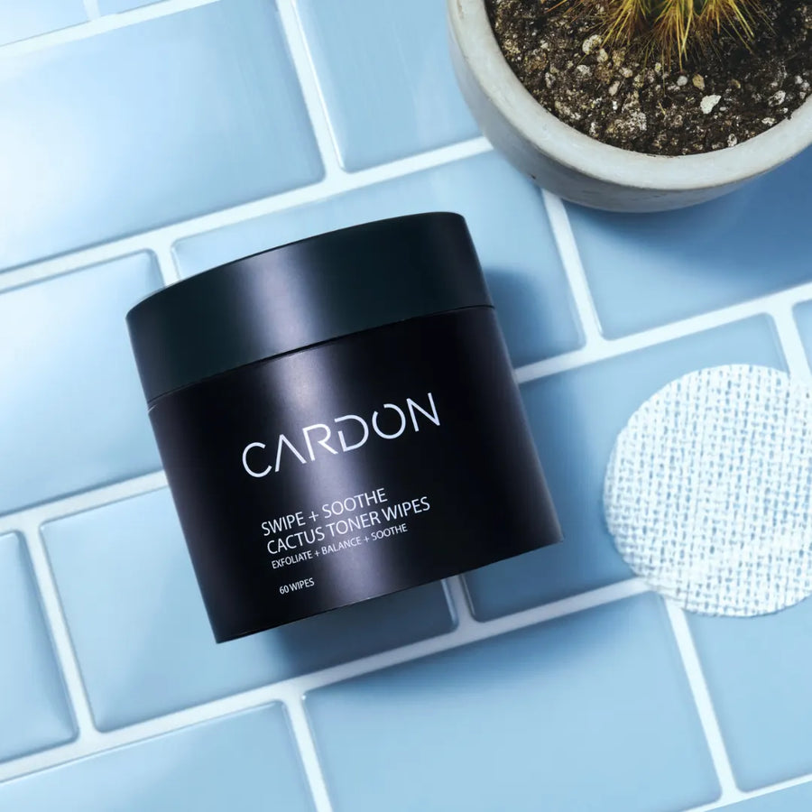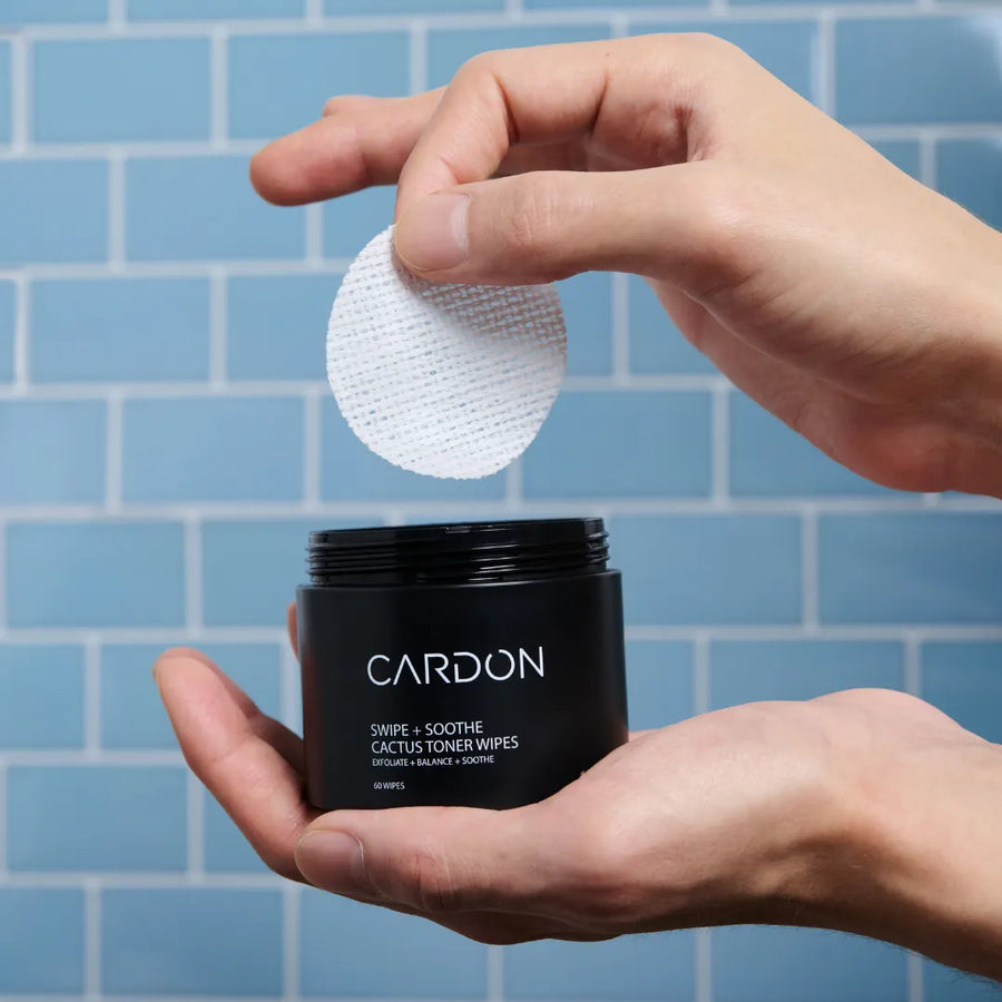 First, look for something that balances oil levels, like witch hazel, oleanolic acid, or enantia chlorantha bark extract. Witch hazel is one of the more common toning ingredients, but it is not well tolerated by dry or sensitive skin. This is why Cardon uses oleanolic acid and enantia chlorantha in its toner wipes formula, to clear pores of excess oil and dead skin cells.