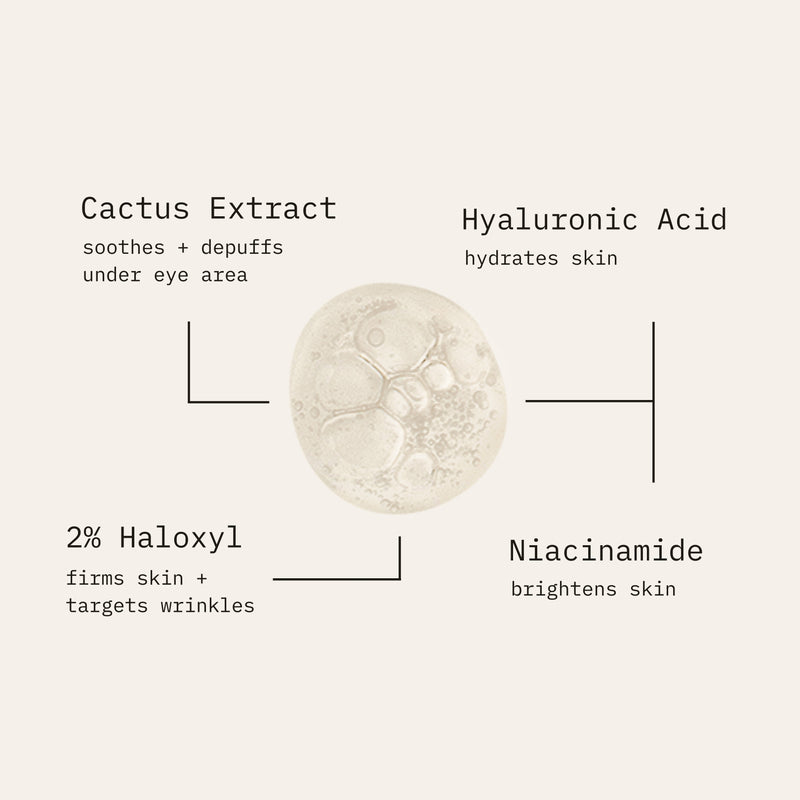 Our eye stick formula is supercharged with high-performing, non-toxic ingredients such as cactus extract, haloxyl, hyaluronic acid and niacinamide.